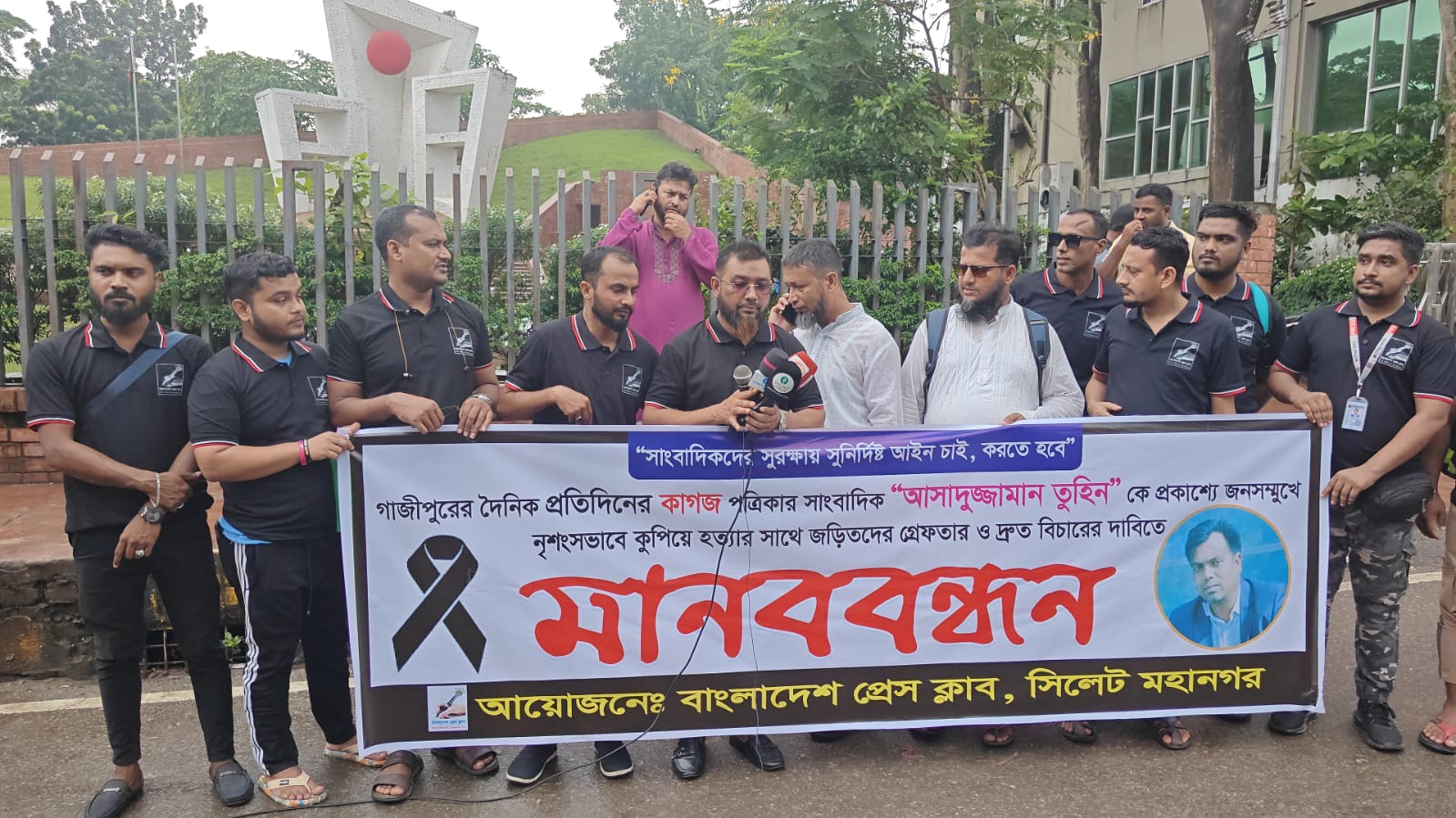 গাজীপুরের সাংবাদিক তুহিন হত্যার আটকৃতদের দ্রুত বিচারের দাবীতে সিলেটে বাংলাদেশ প্রেসক্লাব সিলেট মহানগর শাখার উদ্যোগে এক মানববন্ধন অনুষ্ঠিত হয়েছে। ১২ই আগষ্ট রোজ মঙ্গলবার দুপুর ২,০০ঘটিকার সময় সিলেট কেন্দ্রীয় শহীদ মিনারের সামনে এই মানববন্ধন অনুষ্ঠিত হয়। বাংলাদেশ প্রেসক্লাব সিলেট মহানগরের সভাপতি আমিনুল হকের সভাপতিত্বে ও সাংবাদিক রাজন আহমদের সন্চালনায় স্বাগত্ব বক্তব্য রাখেন সাংবাদিক আশরাফুল ইসলাম বিশেষ অতিথির বক্তব্য রাখেন সাংবাদিক শেখ ফয়ছল জামিল, সাংবাদিক মোঃ শরীফ আহমদ সম্পাদক দৈনিক হলি স্পিচ টিভি. কম,দৈনিক আলোর জগৎ পত্রিকার ব্যুরোচীফ সাংবাদিক ছালিক আহমদ, সাংবাদিক ইউনিয়ন সিলেট জেলার সাধারন সম্পাদক বিপ্লব পাল, প্রধান অতিথির বক্তব্য রাখেন সিলেট রেফারি এসোসিয়েশনের সাধারন সম্পাদক আব্দুল আজিম।