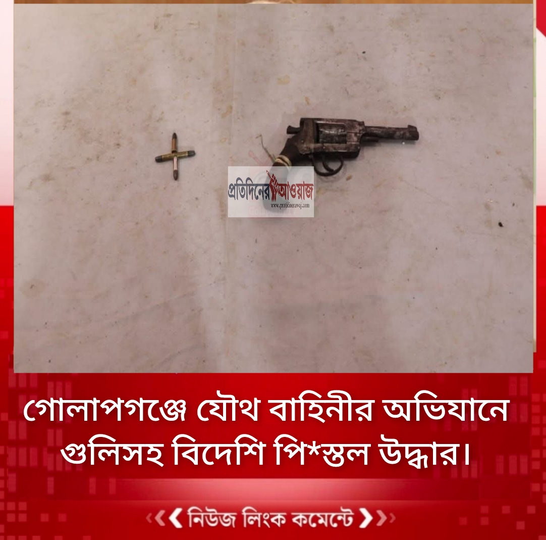 জানা যায়, বুধবার দিবাগত রাত ১২টার দিকে গোপন সংবাদের ভিত্তিতে গোলাপগঞ্জ গ্যাস ফিল্ড আর্মি ক্যাম্প ও র্যাব-৯ এর টহল দল যৌথভাবে অভিযান উপজেলার ফুলবাড়ি ইউনিয়নের কায়স্থগ্রামের কায়স্থাগ্রাম সরকারি প্রাথমিক বিদ্যালয়ের ওয়াশরুম সংলগ্ন নিরাপত্তা ট্যাংকের পাশে থেকে একটি বিদেশি পিস্তল ও ৪টি গুলি পরিত্যক্ত অবস্থায় উদ্ধার করা হয়।