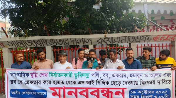 আগামী ২৪ ঘন্টার মধ্যে ভূমিদস্যুদের গ্রেফতার ও দাউদকান্দি থানার ঘুষখোর এস আই সিদ্দিকের বিচারের দাবিতে গতকাল জাতীয় প্রেসক্লাবের সামনে বাংলাদেশ জাতীয় সাংবাদিক সংস্থা ট্রাস্টের উদ্যোগে মানবন্ধন অনুষ্ঠিত হয়েছে।