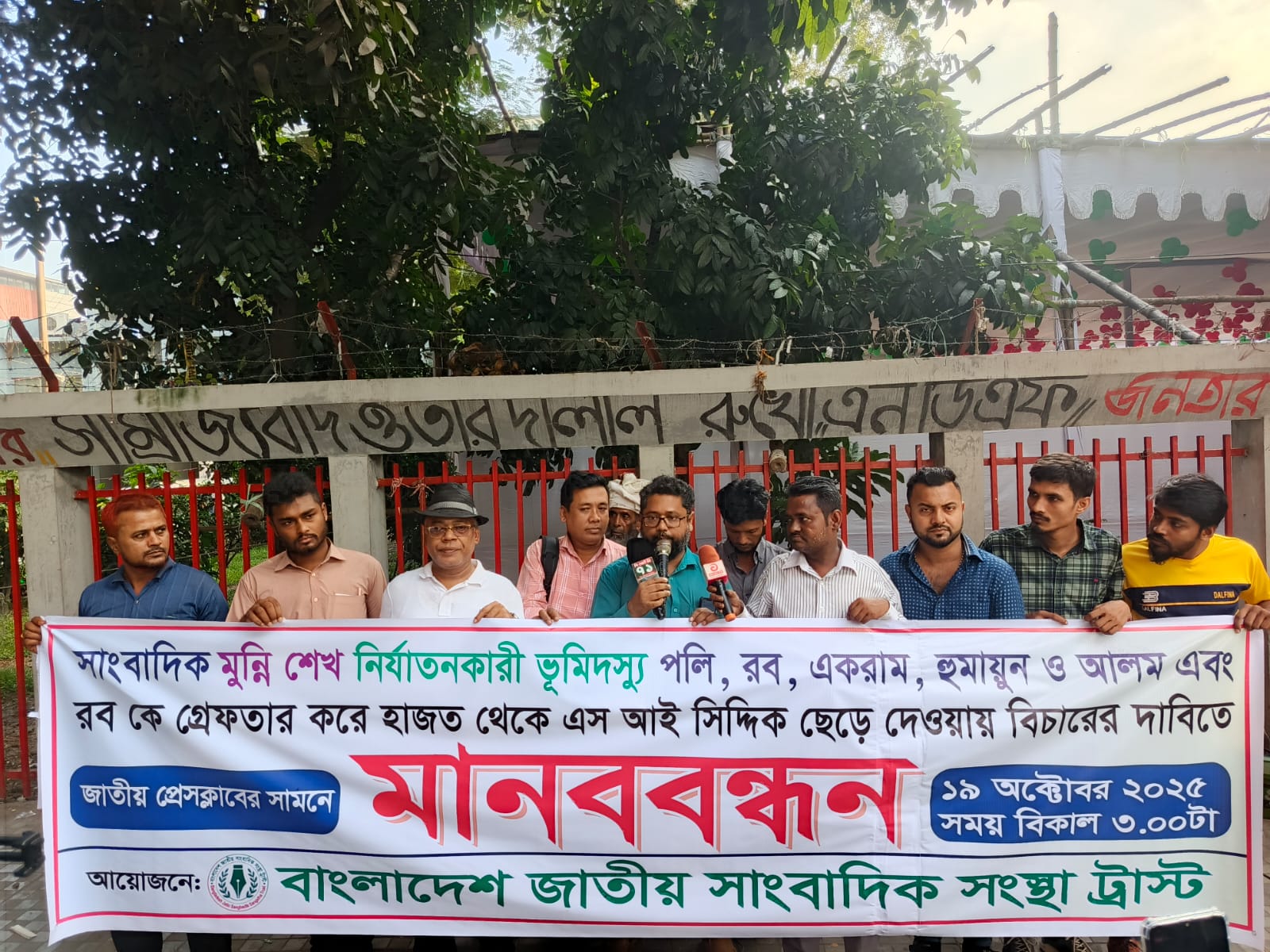 আগামী ২৪ ঘন্টার মধ্যে ভূমিদস্যুদের গ্রেফতার ও দাউদকান্দি থানার ঘুষখোর এস আই সিদ্দিকের বিচারের দাবিতে গতকাল জাতীয় প্রেসক্লাবের সামনে বাংলাদেশ জাতীয় সাংবাদিক সংস্থা ট্রাস্টের উদ্যোগে মানবন্ধন অনুষ্ঠিত হয়েছে।