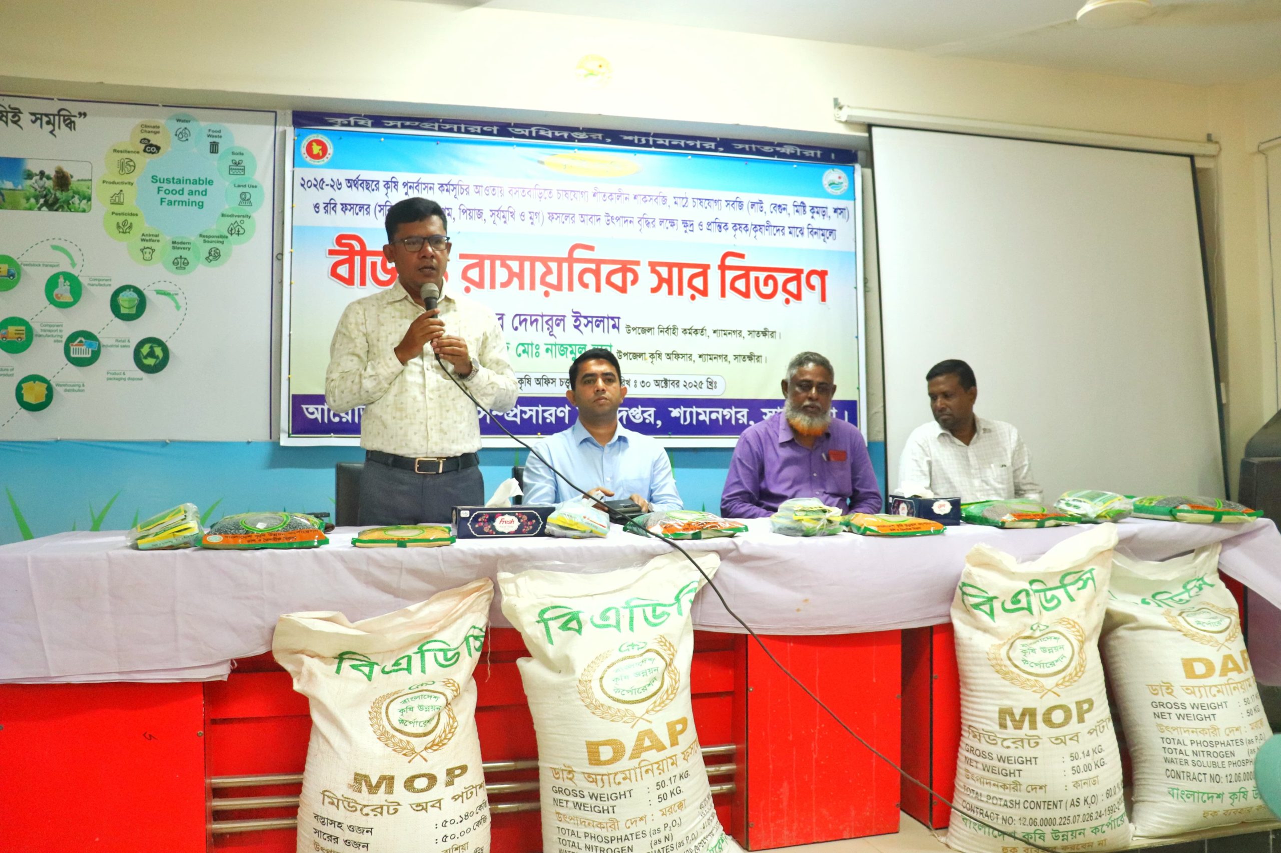 সাতক্ষীরা"র শ্যামনগরে কৃষি সম্প্রসারণ অধিদপ্তর, আয়োজনে উপজেলা কৃষি অফিসার,নাজমুল হুদা সভাপতি ৩০ অক্টোবর বৃহস্পতিবার বেলা ১১ টায় সময় উপজেলা কৃষি অফিস চত্ত্বর বীজ ও রাসায়নিক সার বিতরণ করা হয়।